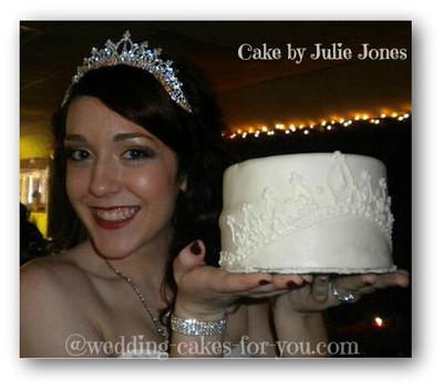 I decided to have the bottom tier of the cake (14” round) draped in fondant to resemble the skirt. The second tier was to look like the bodice, including the beautiful neckline and beading. The middle tier had their monogram encircled with royal icing “pearls,” the fourth tier had a brush-embroidery ivy vine (a favorite of her wedding decorations) crawling around it, and on the top tier, I piped a replica of her exquisite tiara.