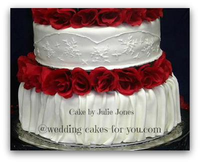 A couple months before, we discussed what kind of wedding cake she wanted. She already had most everything else planned for the event; her colors were cranberry red and navy blue, with silver accents. Rich blue and silver fabric, red roses, cranberries, ivy garland, and twinkle lights adorned the reception hall. But no white.