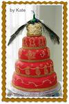 The ideas I had for my cake were pretty extreme too as I wanted my wedding cake to match my dress. Now that may not sounds extreme, but my wedding dress was a traditional Indian Lengha -Choli (skirt and blouse), bright ruby red with thousands of tiny gold jewels and beads hand sewn onto it. In Indian weddings the most auspicious colors are red and gold and the bride wears as much solid gold jewelery as possible, mostly given to her by her in-laws and parents.