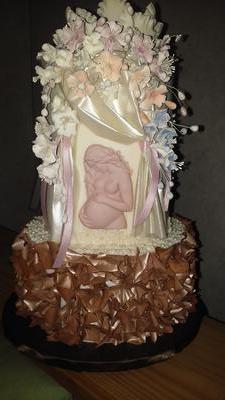 1.Awaiting the Arrival: I molded a pregnant lady surrounded with edible fabric adorned with sugar flowers & pink ribbon. On top was a ranunculous with a molded newborn under petals. Bottom was 1x1 squares of edible chocolate fabric crinkled, cake board is chocolate satin ribbon covered.