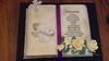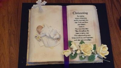4. Christening display: Look of an old book with a bible verse & handcrafted yellow sugar roses, other side of book has hand sculpted baby adorned in a christening outfit with teddy bear toy & a fondant cross, book marker is a purple satin ribbon.