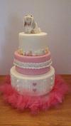 2. Baby girl display: 3 tier - Bottom tier fondant knitted sweater, mid tier fondant lace & ribbon, top tier molded baby embellishments & hand sculpted baby lop eared bunny. Cake board in pink tuille.