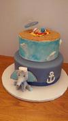 3. Baby Boy display: 2 tier, top tier in brown sugar for beach, fondant baby in sailor dress, beach blanket & life preserver, Cocktail umbrella, bottom tier as ocean with white peaked waves & a hand sculpted baby sailor elephant.