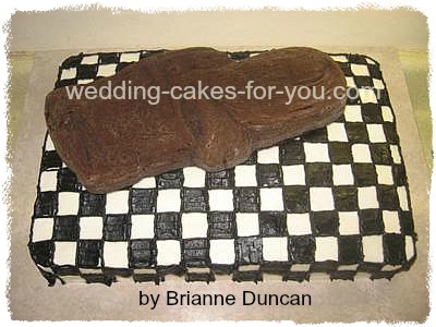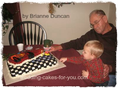 After I had the sheet cake put together, I covered with white buttercream frosting. Then I made a grid from one inch squares/strips to get a checker design. I then piped in black frosting, smoothed the squares out so the white sheet cake looked like a race tracks checkered flag.