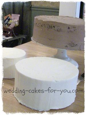 Avoid taking the cold frozen cakes out into a very warm environment as they will sweat and make it very difficult to frost. It is best to take them from the freezer and put them into the refrigerator and then out into the kitchen space.