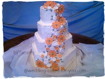 My best friend thought she was going to stump me when she asked me to make her niece's wedding cake. Luckily she gave me 4 months notice. Samantha's wedding colors were orange and white, her flowers were orange Gerbera daisies.