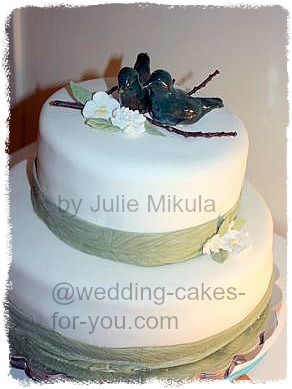 Since there would be a dessert tent with lots of other desserts, we decided to make it two tiers, one 8” and one 12”. Both of us were taking a pottery class, so we thought it might be a good idea to try making pottery birds in class and place them on a branch for the topper.