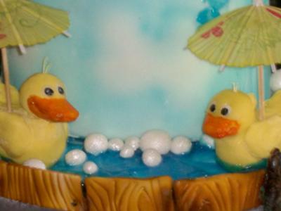 The ducks were hand modeled out of yellow and orange modeling chocolate. The umbrellas were just little drink decorations stuck under the rubber duckies wings. I rolled little balls of fondant for the bubbles and dusted them with white pearl dust for some sparkle.