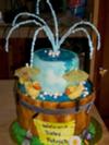I rolled out some grey pieces and cut a piece for the top and bottom of the bucket. On the top of the bucket, I placed my 6" layers and used blue piping gel for the water. In the top of the 6" cake I put a straw inside to hold wires for the water fountain effect. I iced the wires with royal icing to make it look like water droplettes.