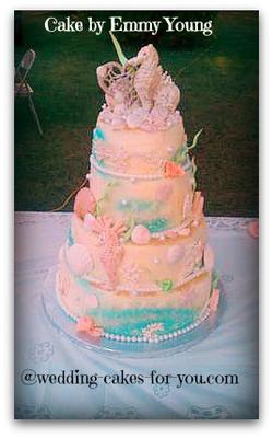 The shells, seahorses and coral were fashioned out of gumpaste. The tiers were stacked and frosted, then sprayed with edible color. I decorated with edible pearls and piles of gumpaste seashells.