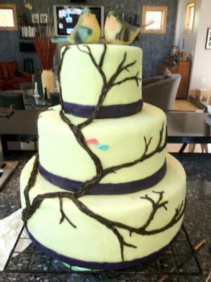 She picked out a very cute set of birds for the cake topper and after several ideas, the best design seemed to be a multicolored tree, leading up to the birds.
